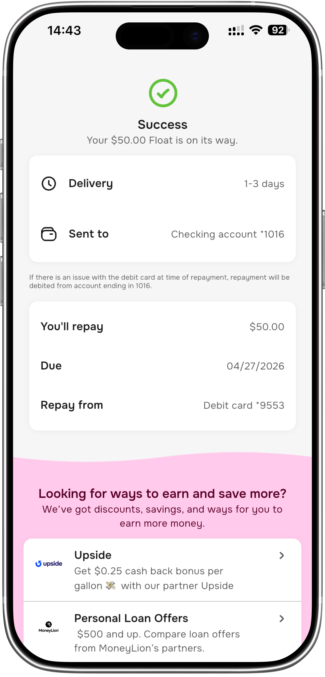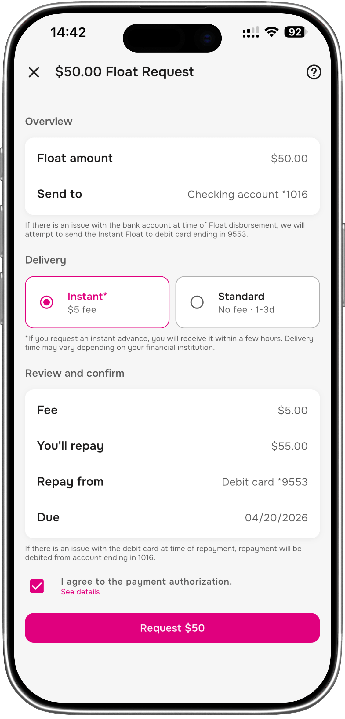 Need it sooner? Instant Floats can hit your account in as little as a few hours, depending on your bank.