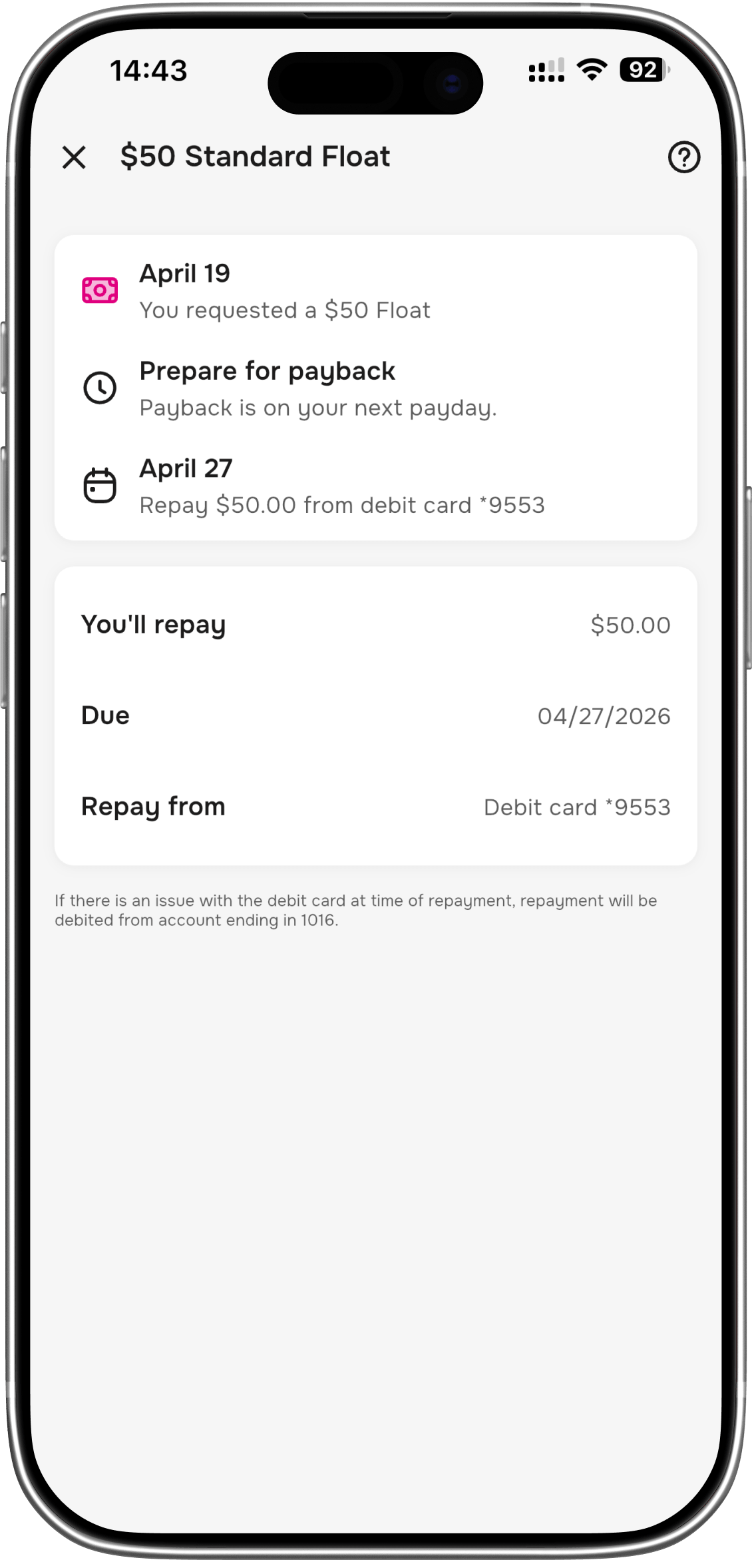 Your Float is automatically repaid when your next paycheck hits, so there is nothing to keep track of.